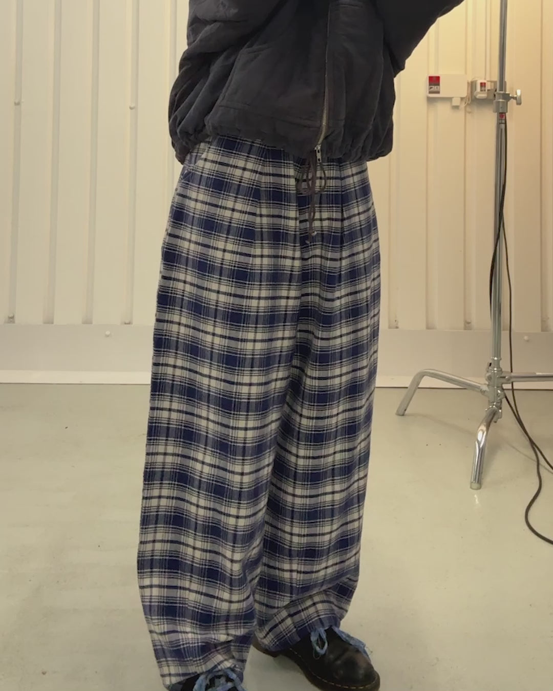 Comfortable, easy fit trousers, made from a hand woven cotton check featuring front pleats, 4 pocket construction, a tapered hem, belt loops and an ecru white tab on the rear waistband.